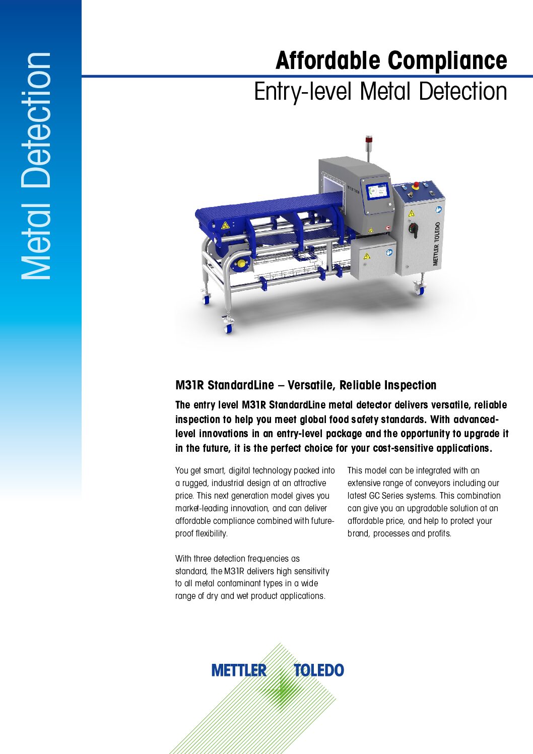 The entry level M31R StandardLine metal detector delivers versatile, reliable inspection to help you meet global food safety standards. With advanced-level innovations in an entry-level package and the opportunity to upgrade it in the future, it is the perfect choice for your cost-sensitive applications.